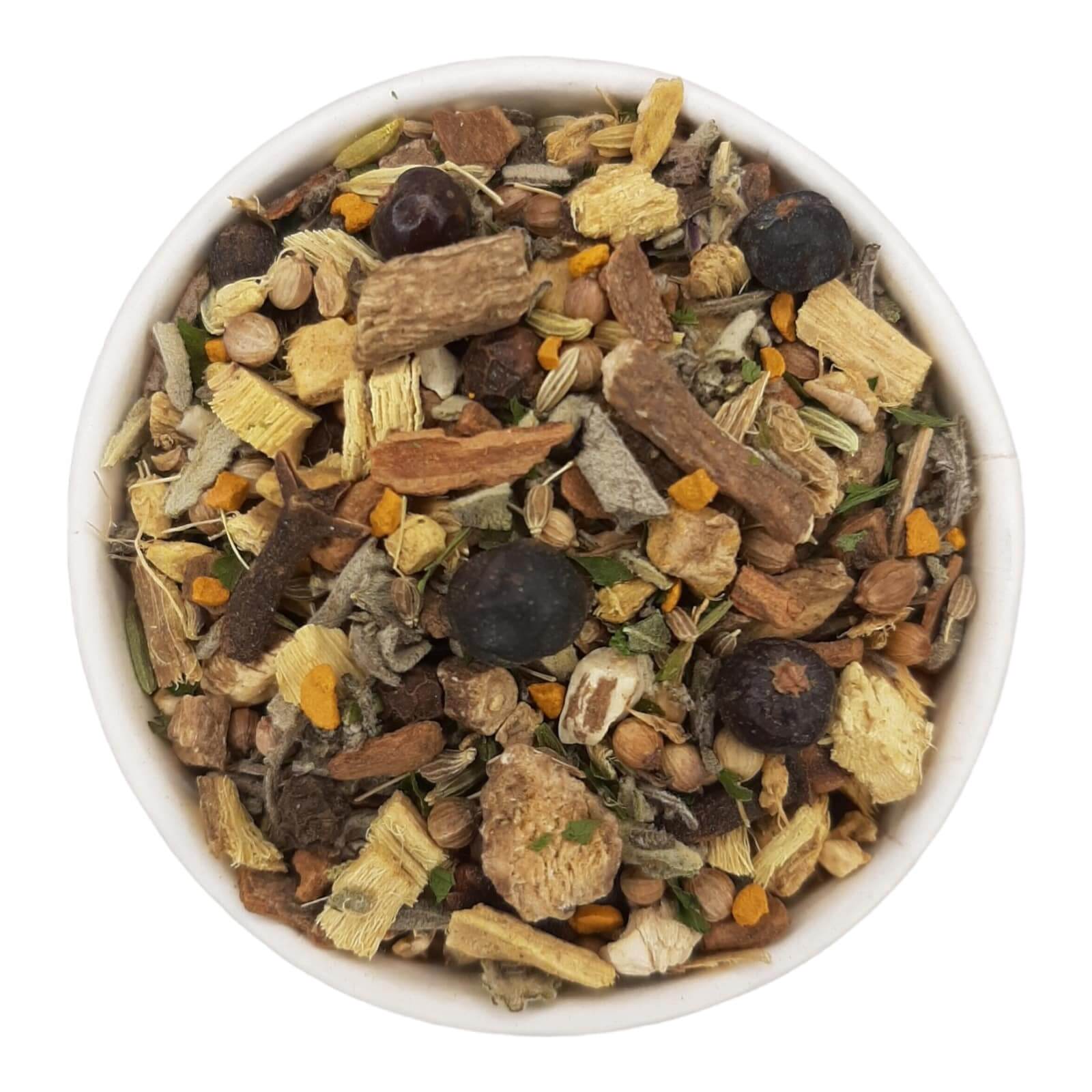 | Ingrediënten | anijs, gember, jeneverbessen, kaneel, klit, koriander, kruidnagelbloem, kurkuma, paardenbloemwortel, paprika, peterselie, salie, venkel, zoethout |