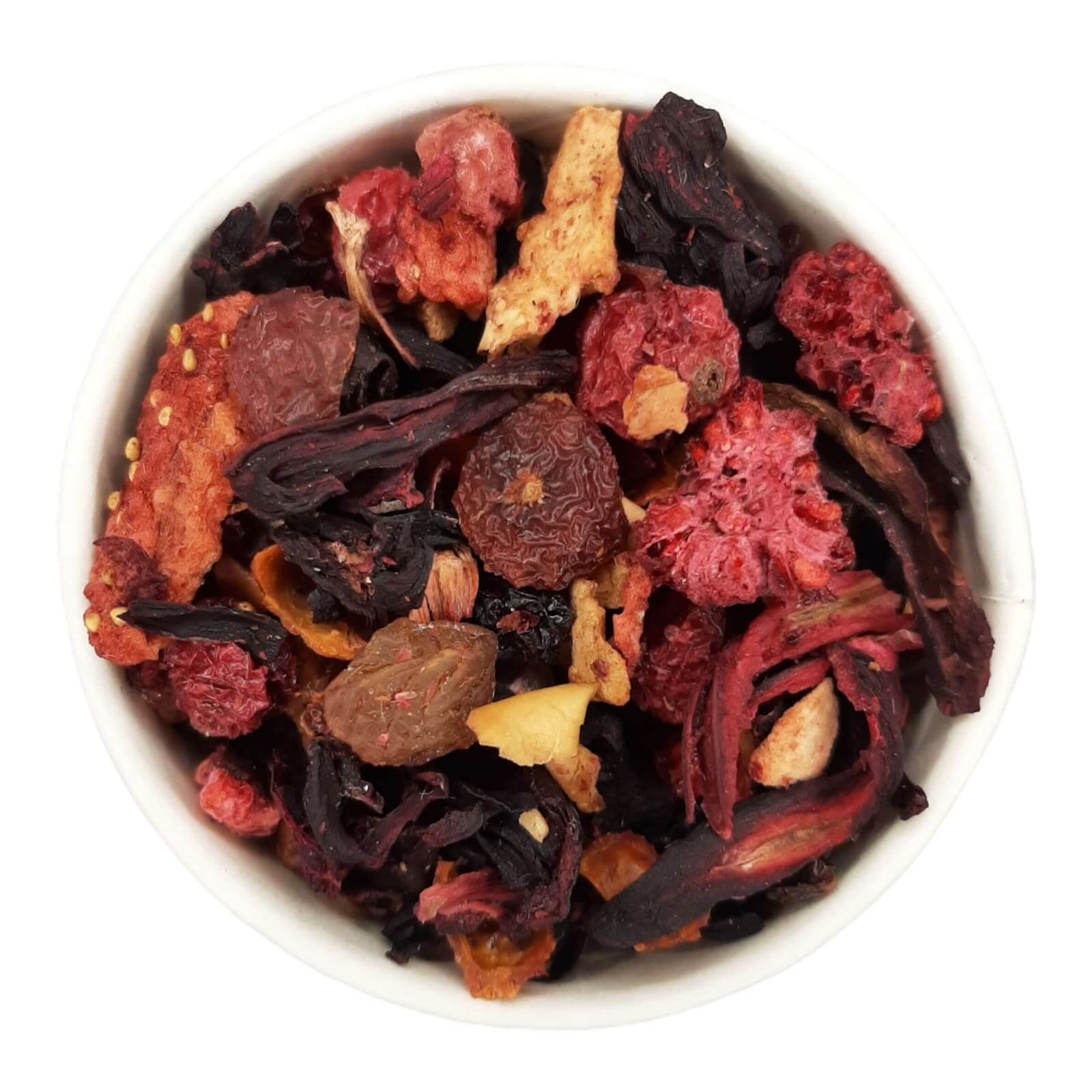 De fruitige tonen van de appel, ananas, papaya, druiven, kersen, framboos, rode bessen en aardbei vormen de hoofdrolspelers in deze thee. Ze bieden een overvloed aan natuurlijke zoetheid en sappigheid, waardoor elke slok een ware fruitexplosie is. De combinatie van verschillende vruchten zorgt voor een harmonieus samenspel van smaken, waarbij de zoetheid van de ananas en papaya mooi wordt gebalanceerd door de lichtzure accenten van de hibiscus en rozenbottel.