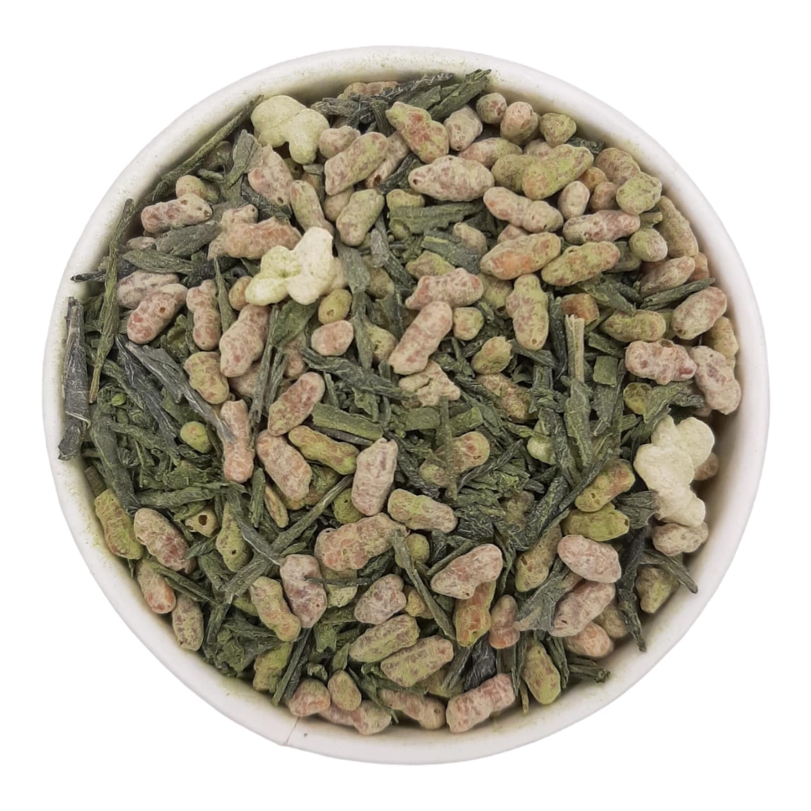 Geroosterde rijst, in het Japans bekend als genmai, is het ingrediënt dat deze thee echt uniek maakt. Met zijn hartige en nootachtige smaak, voegt genmai een aardse dimensie toe aan de thee, die prachtig samengaat met de levendige tonen van de groene thee en matcha.
