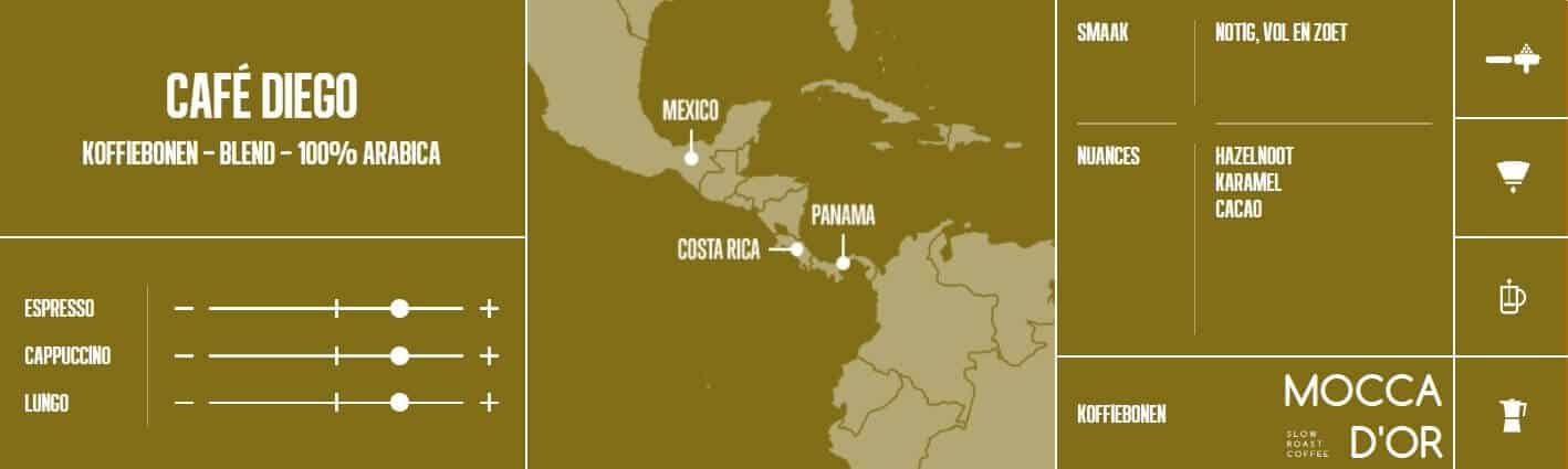 Mocca d’Or Café Diego koffiebonen, samengesteld door Mocca d’Or, is een perfecte blend van 100% Arabica bonen uit Mexico, Costa Rica en Panama. Deze Centraal-Amerikaanse landen staan bekend om hun hoogwaardige koffieproductie en leveren bonen met een milde en toegankelijke smaak. Mocca dOr Café Diego koffiebonen biedt een unieke koffie-ervaring met een karakteristiek smaakprofiel.
