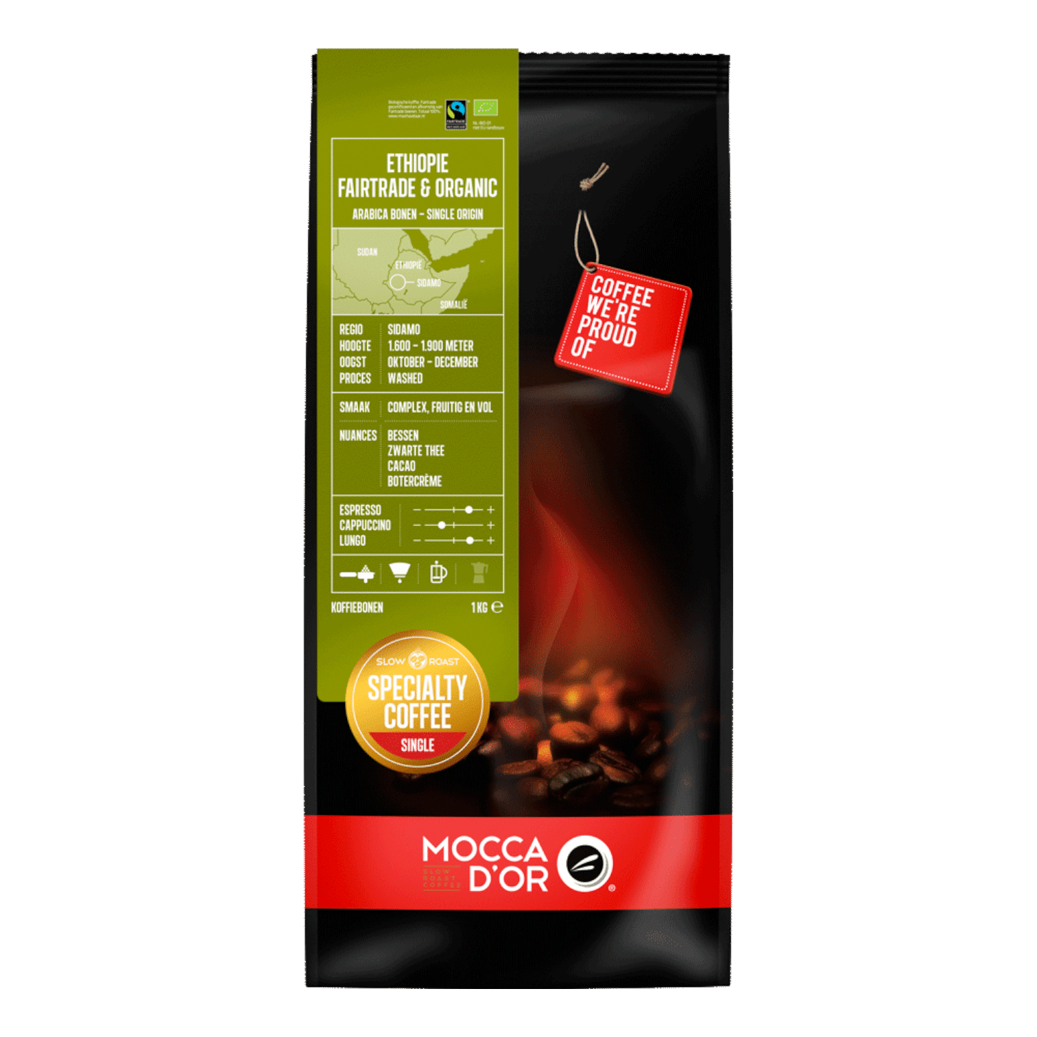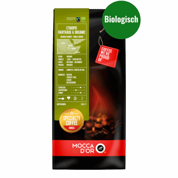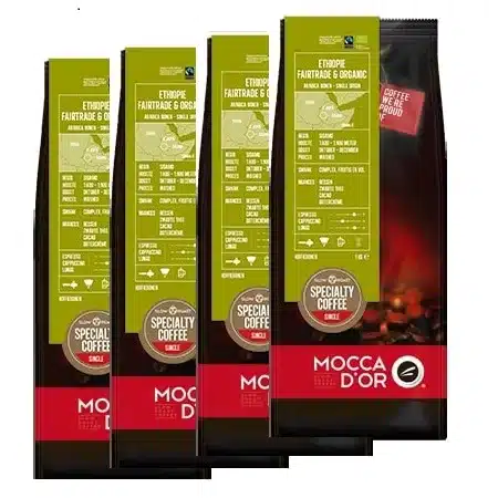 De Mocca d’Or Ethiopië Fairtrade Bio 4kg koffiebonen zijn een bijzondere Single Origin koffie die je meeneemt op een unieke smaakreis. Deze koffie bestaat uit 100% Arabica bonen die niet alleen Fairtrade gecertificeerd zijn, maar ook biologisch geteeld. Met zorg verbouwd en geoogst in de prachtige Sidamo regio in Ethiopië, waar ideale omstandigheden heersen voor de productie van hoogwaardige Mocca d’Or Ethiopië Fairtrade Bio koffiebonen.