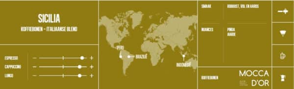De Sicilia is de ultiem krachtige Italiaanse espresso koffie. Deze melange is uitermate geschikt voor het maken van een echte sublieme espresso of cappuccino. De Sicilia is een briljante mix van robusta en arabica koffiebonen, afkomstig uit Zuid- Amerika en Azië.