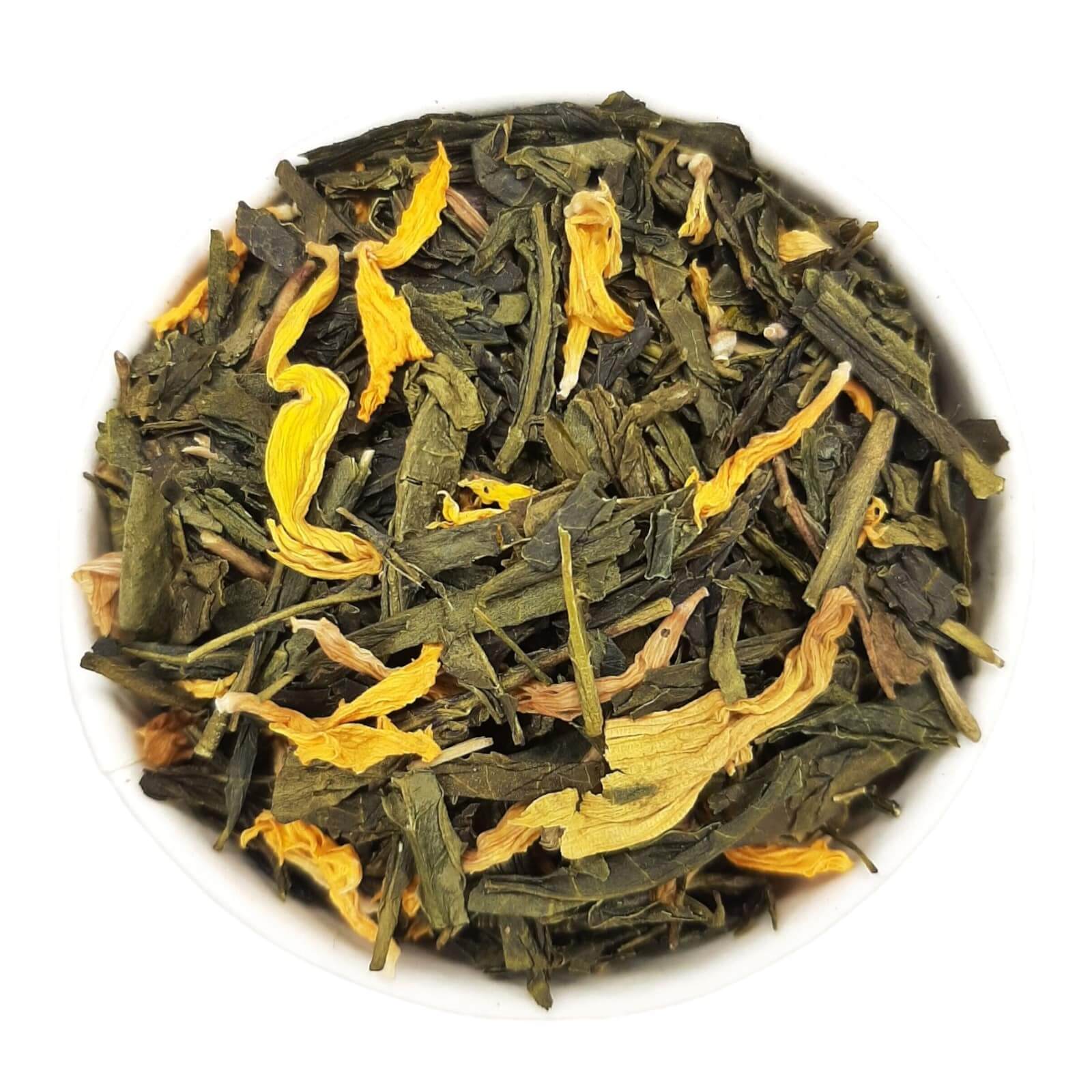 Naast de groene thee, draagt de subtiele smaak van zonnebloemen bij aan de complexiteit van de blend. Deze bloemen voegen niet alleen een visueel element van schoonheid toe aan de thee, maar introduceren ook een zachte bloemigheid. Deze smaak voegt een bepaalde rijkdom en elegantie toe die de thee verheft en complementair is aan de hoofdtonen.