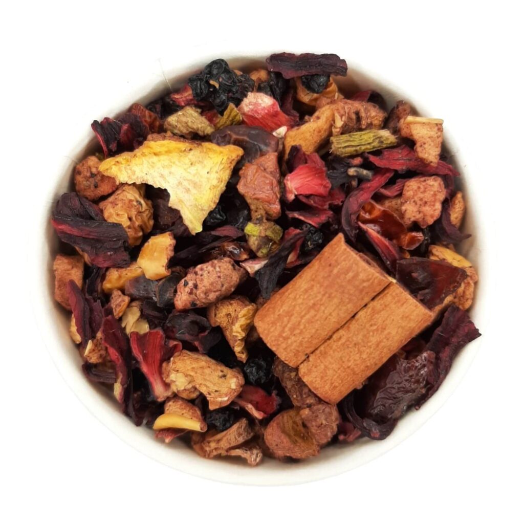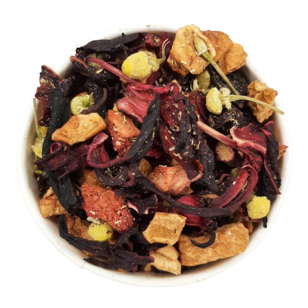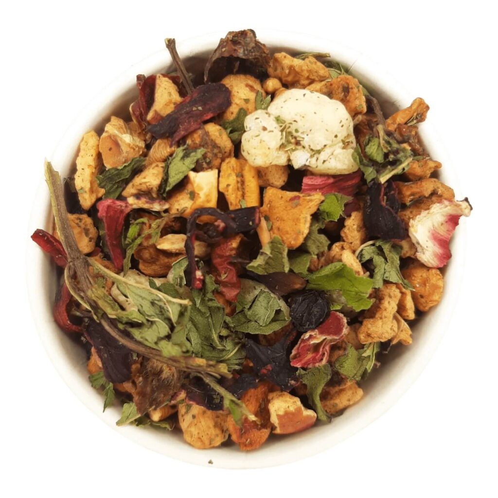 Geniet van een kleurrijk en aromatisch drankje boordevol natuurlijke ingrediënten zoals gedroogd fruit, bloemblaadjes en kruiden.