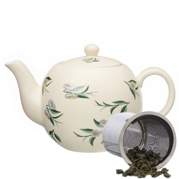 De nieuwe porseleinen theepotten met iconische decoratie zijn speciaal voor La Via del Tè gemaakt. Ze zijn ruim, functioneel en elegant en uitgerust met een uitneembaar binnenfilter van lasergesneden roestvrij staal. Thee is afkomstig van de verwerking van Camelia Sinensis, een plant die groeit in streken met een warm en vochtig klimaat, en het is de bloem van deze plant die de hoofdrol speelt in het patroon van deze theepotten.